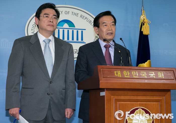 (서울=포커스뉴스) 20대 총선 공천 배제(컷오프)된 서상기(오른쪽), 홍지만 새누리당 의원이 16일 오전 서울 여의도 국회 정론관에서 불출마 선언 및 당 결정 수용 기자회견을 하고 있다.
