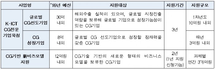 이에 미래부는 그간 해외 CG프로젝트 수주 시 프로젝트 수행자금을 단기간(1년 이내) 지원하던 방식에서 벗어나, 국내 CG기업이 연구개발(R&D) 및 인력양성, 제작시스템 고도화, 해외진출 전략 등 중장기 성장전략을 수립하고, 이에 따른 경쟁력 강화 프로그램을 체계적으로 추진할 수 있도록 3년 동안 선정기업 당 민관 공동 48억원(정부 24억원))을 지원한다는 방침이다.