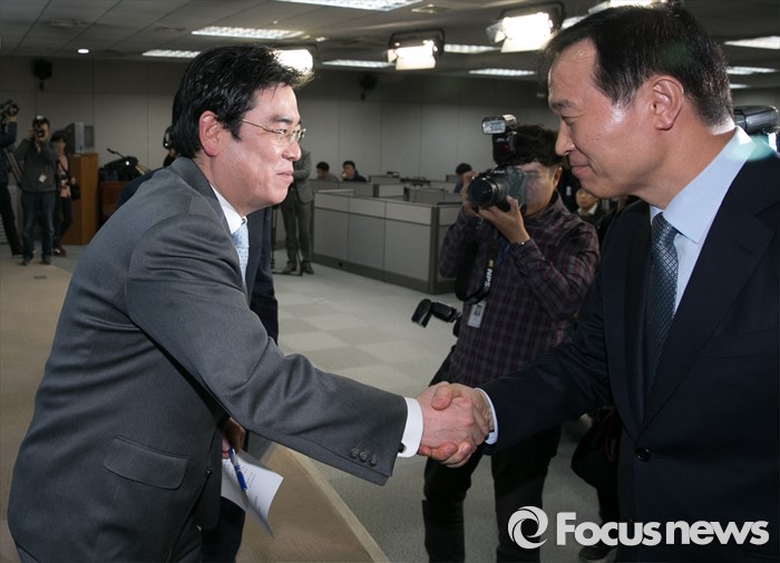(서울=포커스뉴스) 20대 총선 공천 배제(컷오프)된 홍지만(왼쪽) 새누리당 의원이 16일 오전 서울 여의도 국회 정론관에서 불출마 선언 및 당 결정 수용 기자회견을 마친 뒤 나서며 공천 탈락에 반발해 탈당 및 무소속 출마 회견을 위해 입장하는 임태희 전 의원과 악수하고 있다.