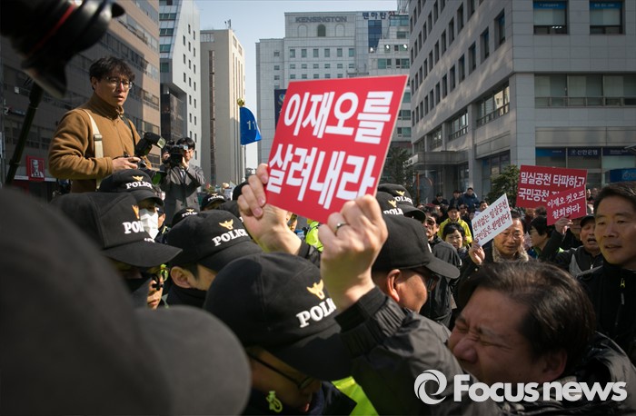 (서울=포커스뉴스) 16일 오전 서울 여의도 새누리당사 앞에서 열린 공천 배제(컷오프)된 이재오 의원의 공천관리위원회의 결정 철회를 촉구하는 지지자들의 집회에 참가한 한 지지자가 경찰과 승강이를 벌이고 있다.