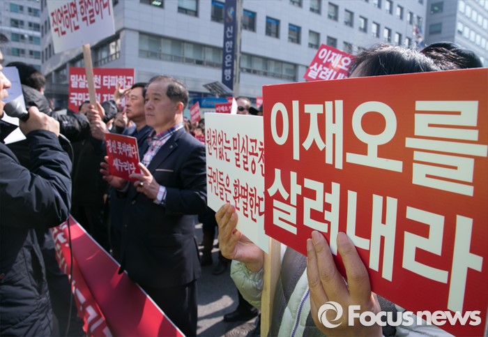 (서울=포커스뉴스) 16일 오전 서울 여의도 새누리당사 앞에서 공천 배제(컷오프)된 이재오 의원의 지지자들이 공천관리위원회의 결정 철회를 촉구하는 집회를 하고 있다.