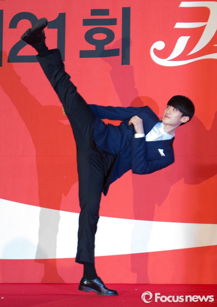 (서울=포커스뉴스) 16일 오전 서울 중구 더플라자호텔 그랜드볼룸에서 제21회 코카콜라 체육대상 시상식에 참석한 이대훈이 우수선수상 수상 세리머니를 하고 있다.