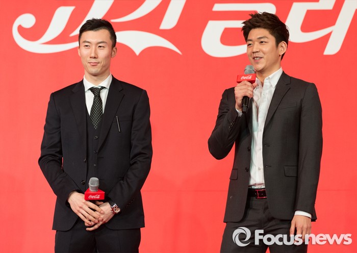 (서울=포커스뉴스) 16일 오전 서울 중구 더플라자호텔 그랜드볼룸에서 제21회 코카콜라 체육대상 시상식에 참석한 이용대(오른쪽)와 유연성이 우수단체상 수상 후 소감을 전하고 있다.