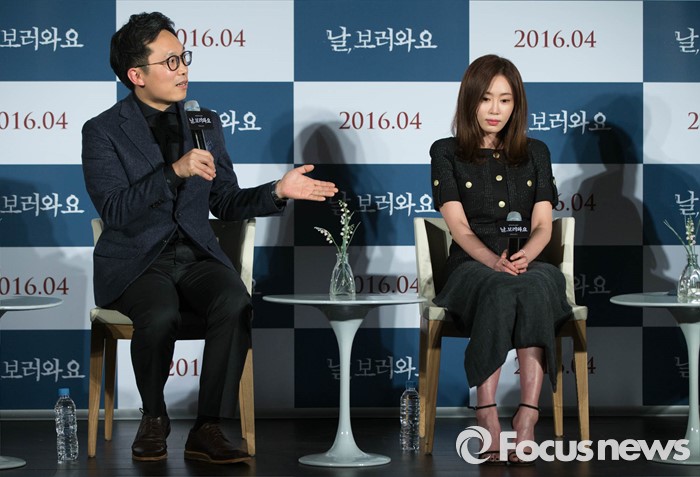 (서울=포커스뉴스) 16일 오전 서울 동대문 메가박스에서 열린 영화 '날,보러와요(감독 이철하)' 제작보고회에 참석한 이철하(왼쪽)감독이 배우 강예원을 극찬하고 있다. 영화 '날,보러와요'는 이유도 모른채 정신병원에 납치 강금된 여자(강예원)와 시사프로 소재를 위해 그녀의 사연에 관심을 갖게 된 PD(이상윤)가 밝혀낸 믿을 수 없는 진실에 대한 충격실화 스릴러다.