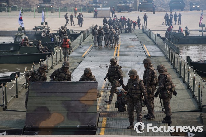 (이천=포커스뉴스) 16일 오전 경기도 이천시 7공병여단 도하훈련장에서 열린 '한·미 연합 소부대 도하훈련'에서 한국군 제7공병여단 도하대대와 미군 제2전투항공여단 공병대대 장병들이 부교를 설치하고 있다.