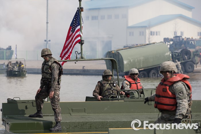 (이천=포커스뉴스) 16일 오전 경기도 이천시 7공병여단 도하훈련장에서 열린 '한·미 연합 소부대 도하훈련'에서 한국군 제7공병여단 도하대대와 미군 제2전투항공여단 공병대대 장병들이 부교 설치 작업을 하고 있다.