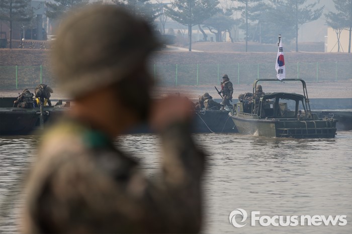 (이천=포커스뉴스) 16일 오전 경기도 이천시 7공병여단 도하훈련장에서 열린 '한·미 연합 소부대 도하훈련'에서 한국군 제7공병여단 도하대대 장병들이 부교를 설치를 위해 경계 근무를 서고 있다.