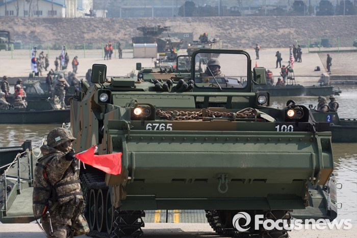 (이천=포커스뉴스) 16일 오전 경기도 이천시 7공병여단 도하훈련장에서 열린 한국군 제7공병여단 도하대대와 미군 제2전투항공여단 공병대대의 '한·미 연합 소부대 도하훈련'에서 전차와 장갑차들이 부교를 도하하고 있다.