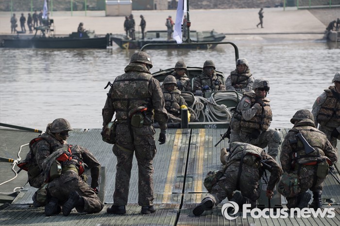 (이천=포커스뉴스) 16일 오전 경기도 이천시 7공병여단 도하훈련장에서 열린 '한·미 연합 소부대 도하훈련'에서 한국군 제7공병여단 도하대대와 미군 제2전투항공여단 공병대대 장병들이 부교를 설치하고 있다.