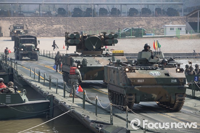 (이천=포커스뉴스) 16일 오전 경기도 이천시 7공병여단 도하훈련장에서 열린 한국군 제7공병여단 도하대대와 미군 제2전투항공여단 공병대대의 '한·미 연합 소부대 도하훈련'에서 전차와 장갑차들이 부교를 도하하고 있다.