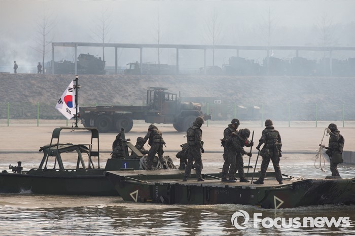 (이천=포커스뉴스) 16일 오전 경기도 이천시 7공병여단 도하훈련장에서 한국군 제7공병여단 도하대대와 미군 제2전투항공여단 공병대대의 '한·미 연합 소부대 도하훈련'을 마친 장병들이 파이팅하고 있다.