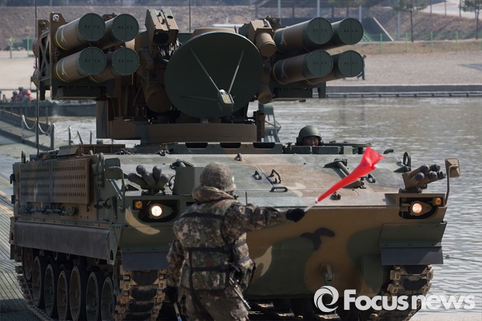(이천=포커스뉴스) 16일 오전 경기도 이천시 7공병여단 도하훈련장에서 열린 한국군 제7공병여단 도하대대와 미군 제2전투항공여단 공병대대의 '한·미 연합 소부대 도하훈련'에서 전차와 장갑차들이 부교를 도하하고 있다.