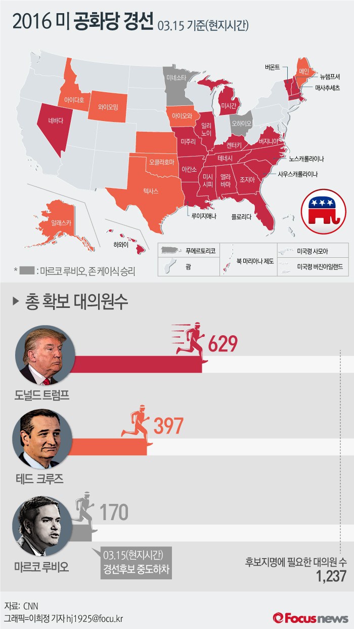(서울=포커스뉴스) 미니슈퍼화요일인 15일(현지시간) 공화당 선두주자 도널드 트럼프가 플로리다, 오하이오, 노스캐롤라이나, 일리노이주 경선에서 승리했다. 오하이오에서는 주지사 존 케이식이 승리했다. 공화당의 마르코 루비오는 그의 지역구인 플로리다에서 참패하고 선거운동을 중단했다.