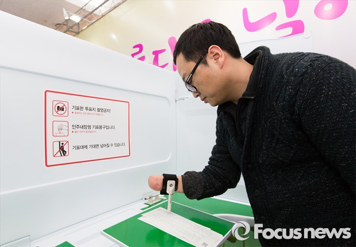 (서울=포커스뉴스) 16일 오후 서울 영등포구 이룸센터에서 열린 '20대 총선 거동불편유권자 대상 사전투표 모의 체험행사'에 참석한 장애인 유권자가 손목활용형 기표용구로 투표 시연을 하고 있다.