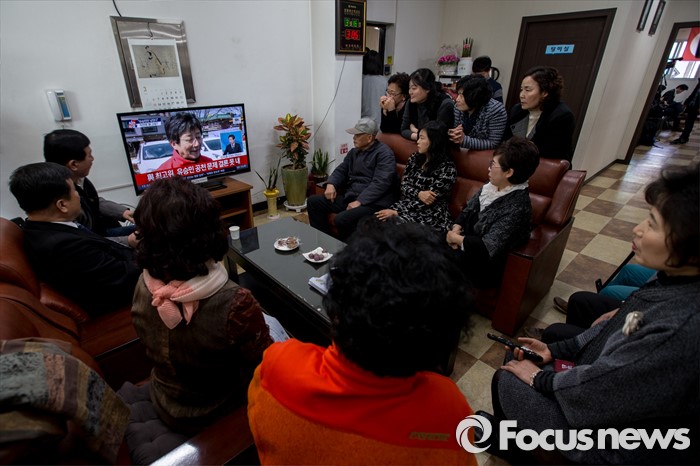 (대구=포커스뉴스) 새누리당이 유승민(대구 동구을) 의원에 대한 공천 배제안을 놓고 고민하고 있는 16일 오후 대구 동구 유 의원 선거사무소에 모인 지지자들이 뉴스를 시청 하고 있다.