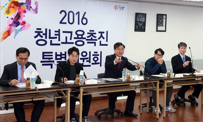 (서울=포커스뉴스) 이기권 고용노동부 장관이 15일 오후 서울 종로구 소재 MJC보석직업전문학교를 방문, 2016년 제1차 청년고용촉진특별위원회를 열고 청년패널들의 의견을 수렵하고 있다. <사진제공=고용노동부>