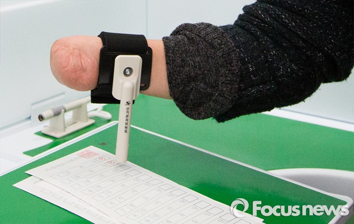 (서울=포커스뉴스) 16일 오후 서울 영등포구 이룸센터에서 열린 '20대 총선 거동불편유권자 대상 사전투표 모의 체험행사'에 참석한 장애인 유권자가 손목활용형 기표용구로 투표 시연을 하고 있다.