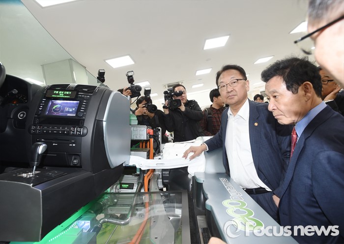 (광주=포커스뉴스) 유일호 부총리 겸 기획재정부 장관이16일 지역전략산업 육성을 위한 규제프리존 도입과 관련 광주광역시를 첫 현장 방문, 그린카진흥원 수소융합스테이션에서 관계자의 설명을 듣고 있다. <사진제공=기획재정부>