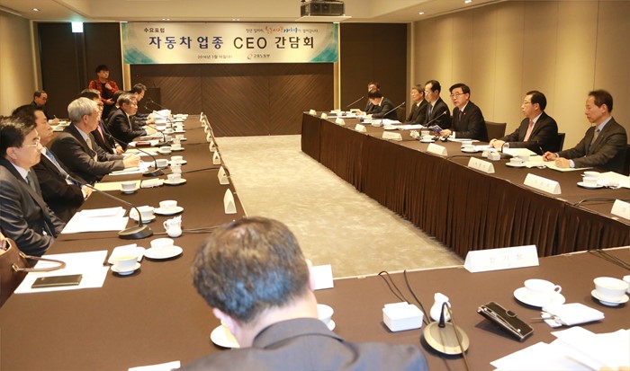 (서울=포커스뉴스) 이기권 고용노동부 장관이 16일 오전 서울 더플라자호텔(4층오키드홀)에서 현대차・기아차・한국GM등 자동차 업종 14개 기업 CEO들과 간담회를 갖고 있다. <사진제공=고용노동부>