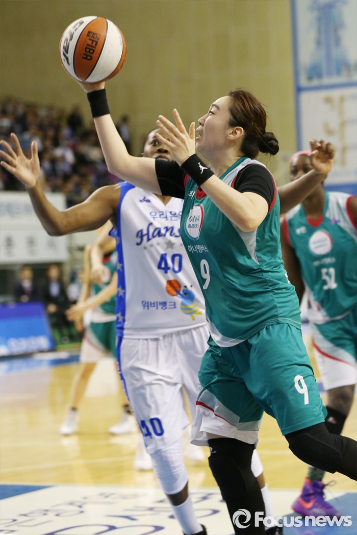 (춘천=포커스뉴스) 춘천호반체육관에서 열린 2015~2016 여자프로농구 우리은행-KEB하나 챔피언결정전 1차전에서 KEB하나 백지은이 우리은행 스트릭렌의 마크를 뚫고 레이업슛을 쏘고 있다.