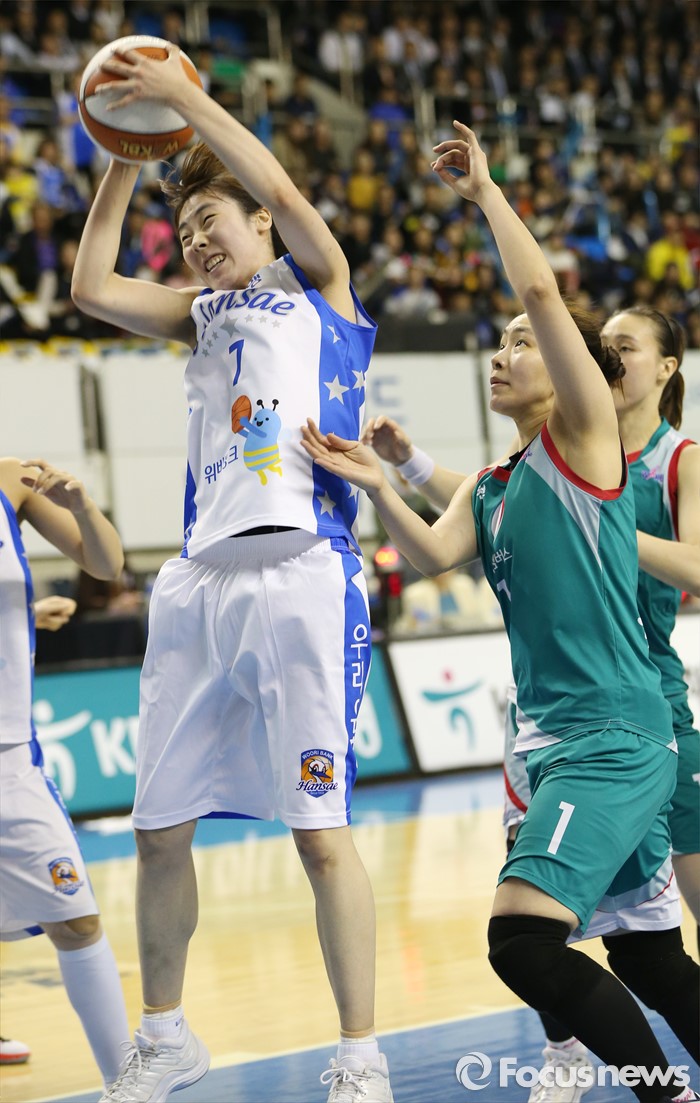 (춘천=포커스뉴스) 춘천호반체육관에서 열린 2015~2016 여자프로농구 우리은행-KEB하나 챔피언결정전 1차전에서 우리은행 박혜진이 KEB하나 염윤아에 앞서 리바운드볼을 잡고 있다.
