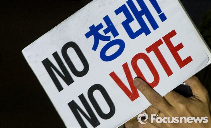 | △ 정청래 컷오프 철회 요구하는 손팻말 |