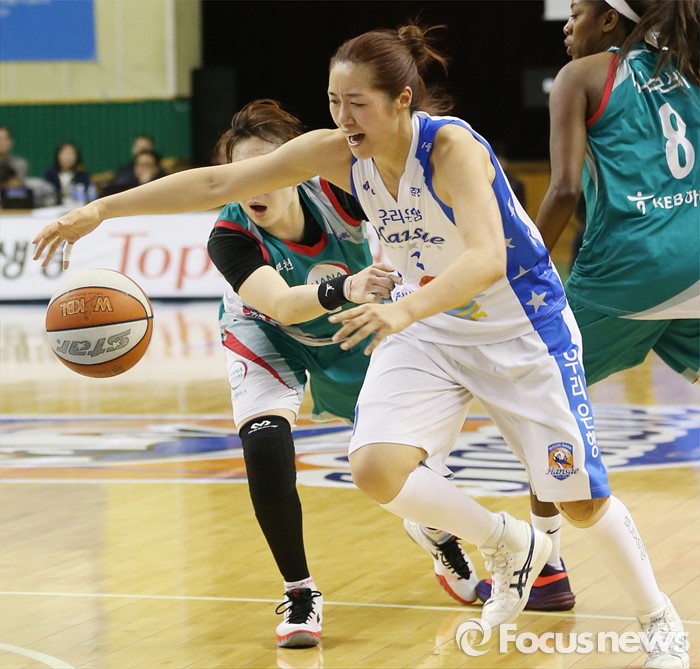 (춘천=포커스뉴스) 춘천호반체육관에서 열린 2015~2016 여자프로농구 우리은행-KEB하나 챔피언결정전 1차전에서 우리은행 양지희가 KEB하나 백지은의 마크를 뿌리치며 돌파하고 있다.