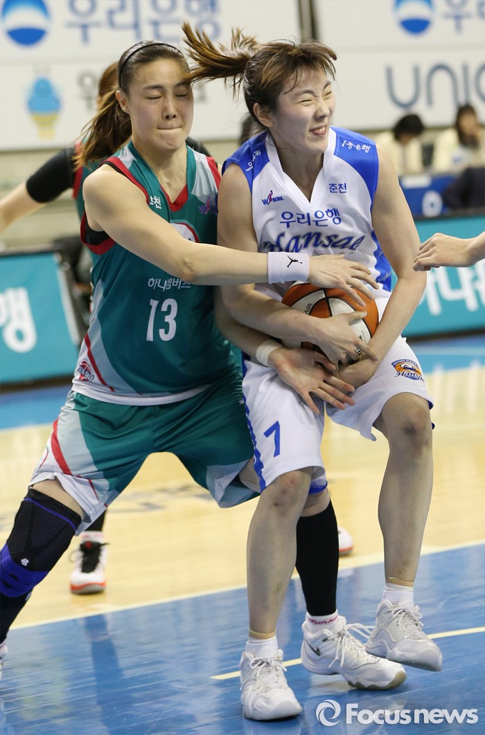 (춘천=포커스뉴스) 춘천호반체육관에서 열린 2015~2016 여자프로농구 우리은행-KEB하나 챔피언결정전 1차전에서 KEB하나 김정은이 우리은행 박혜진의 볼을 뺏으려 하고 있다.