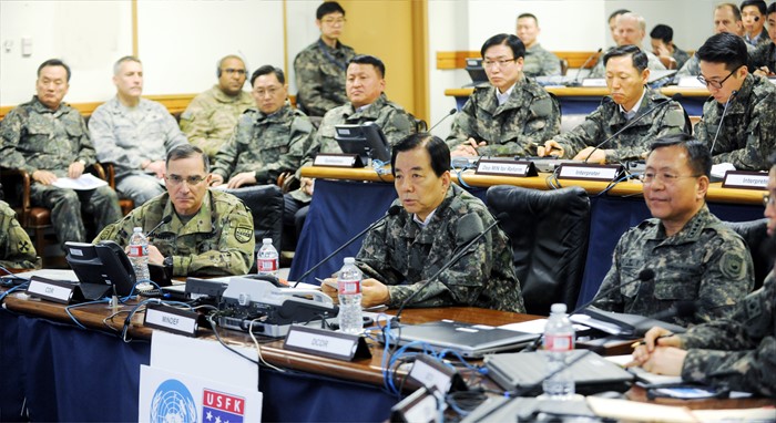 (서울=포커스뉴스) 한민구 국방부 장관이 16일 키리졸브(KR) 연습이 진행중인 한·미연합군사령부 훈련장을 방문, 인사말을 하고 있다. <사진제공=국방부>