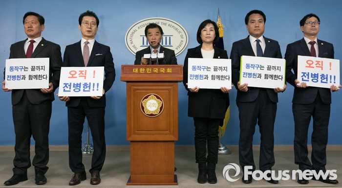 (서울=포커스뉴스) 공천 배제(컷오프)된 전병헌 더불어민주당 의원의 지역위원회 당원들이 17일 오전 서울 여의도 국회 정론관에서 전 의원을 지지하는 기자회견을 하고 있다.