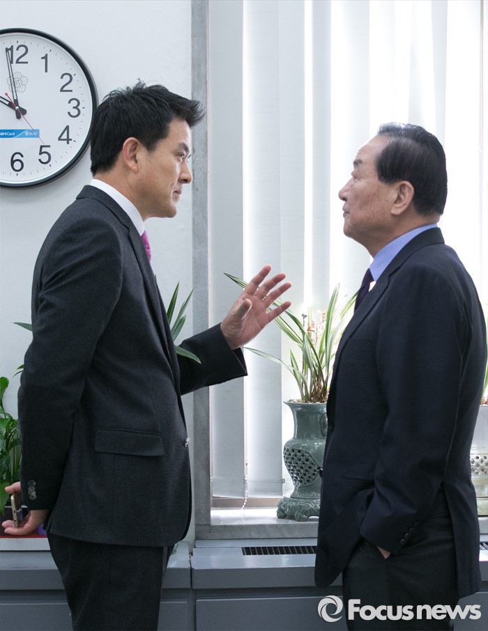 (서울=포커스뉴스) 서청원(오른쪽) · 김태호 새누리당 최고위원이 17일 오전 서울 여의도 국회에서 열린 최고위원회 간담회에 참석해 대화하고 있다. 김무성 대표가 불참한 이날 새누리당 최고위 간담회에서는 원유철 원내대표와 일부 최고위원들이 참석해, 공천관리위원회의 의결과 관련해 논의하는 것으로 알려졌다.