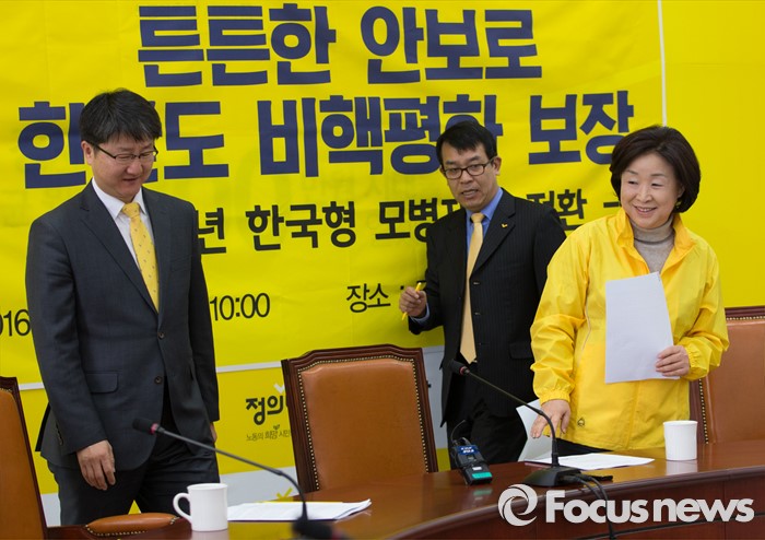 (서울=포커스뉴스) 심상정 정의당 상임대표(오른쪽)가 김종대 예비 국방장관(오른쪽 두번째)과 함께 17일 오전 서울 여의도 국회에서 국방정책기조 및 대표공약 발표 기자회견을 하기 위해 회견장을 들어서고 있다.