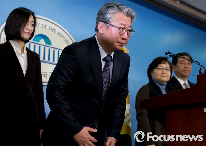(서울=포커스뉴스) 더불어민주당에 입당한 조응천 전 청와대 공직기강비서관이 17일 오전 서울 여의도 국회 정론관에서 20대 총선 경기 남양주갑 출마 선언을 마친 뒤 인사하고 있다.