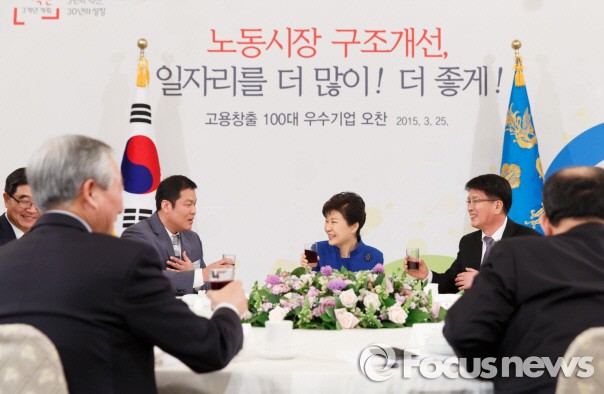 이에 앞서 박 대통령은 정오에 2015년도 고용창출 100대 우수기업 대표를 청와대로 초청해 우수기업 인증패를 수여하고, 오찬을 함께 했다.