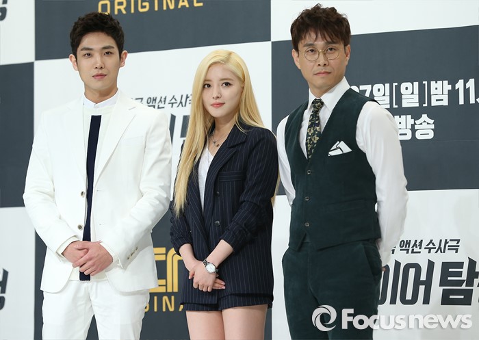 (서울=포커스뉴스) 17일 오후 서울 영등포구 타임스퀘어 아모리스홀에서 열린 OCN 드라마 '뱀파이어 탐정' 제작발표회에 참석한 배우 이준(왼쪽부터), 이세영, 오정세가 포토타임을 갖고 있다.