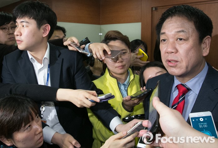(서울=포커스뉴스) 새누리당 공천관리위원회 외부위원들이 김무성 대표의 사과를 요구하며 회의를 보이콧한 17일 오후 서울 여의도 당사에서 회의를 마친 박종희 제2사무부총장이 취재진 질문에 답하고 있다.