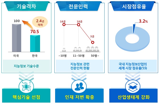 우리나라에서 내로라하는 정보통신 분야 대기업들의 인공지능사업에 대한 공통적인 반응이다. 이세돌 9단과 알파고의 대전으로 인공지능이 급부상하자 정부는 로드맵을 내놨지만 갈 길이 멀다. 다른 나라가 인공지능 산업에 들이는 예산에 비해 턱없이 적은 수준일 뿐만 아니라 인공지능을 담당하는 컨트롤타워도 없는 상황이다.
