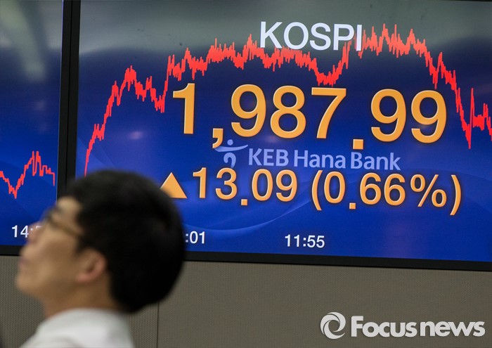 (서울=포커스뉴스) 17일 서울 중구 KEB외환은행 본점 딜링룸 전광판에 코스피지수가 전일보다 13.09p (0.66%) 상승한 1987.99를 나타내고 있다. 코스피는 장중 2000선을 돌파했으며, 원·달러 환율은 전일 종가 대비 20원 내린 1173.3원으로 지난해 12월 30일(1172.5원) 이후 약 석달만에 종가 기준 1170원대를 기록했다.