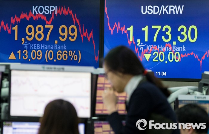 (서울=포커스뉴스) 17일 서울 중구 KEB외환은행 본점 딜링룸 전광판에 코스피지수가 전일보다 13.09p (0.66%) 상승한 1987.99, 원달러환율은 전일 종가 대비 20원 내린 1173.3원를 나타내고 있다. 이날 코스피는 장중 2000선을 돌파했으며, 원·달러 환율은 전일 종가 대비 20원 내린 1173.3원으로 지난해 12월 30일(1172.5원) 이후 약 석달만에 종가 기준 1170원대를 기록했다.