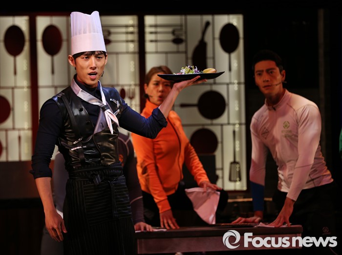(서울=포커스뉴스) 3일 오후 서울 종로구 유니플렉스에서 열린 뮤지컬 '로멘틱 머슬' 프레스콜에 참석한 배우 백성현이 주요장면을 시연하고 있다.
