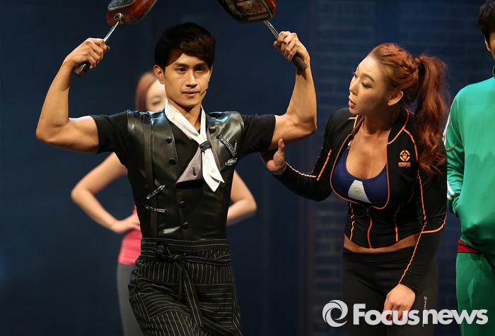 (서울=포커스뉴스) 3일 오후 서울 종로구 유니플렉스에서 열린 뮤지컬 '로멘틱 머슬' 프레스콜에 참석한 배우 최동호(왼쪽)가 주요장면을 시연하고 있다.