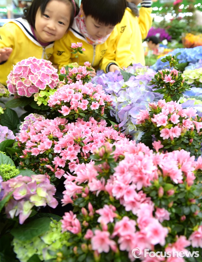 (서울=포커스뉴스) 17일 서울 서초구 하나로클럽 양재점에서 열린 '새봄맞이 봄꽃축제'에서 어린이들이 형형색색의 봄꽃들을 관찰하고 있다. 농협유통은 이번 행사를 통해 수선화 3,000원, 튤립 2,500원 등 다양한 봄꽃을 최대 30% 할인 판매한다. <사진제공=농협유통>