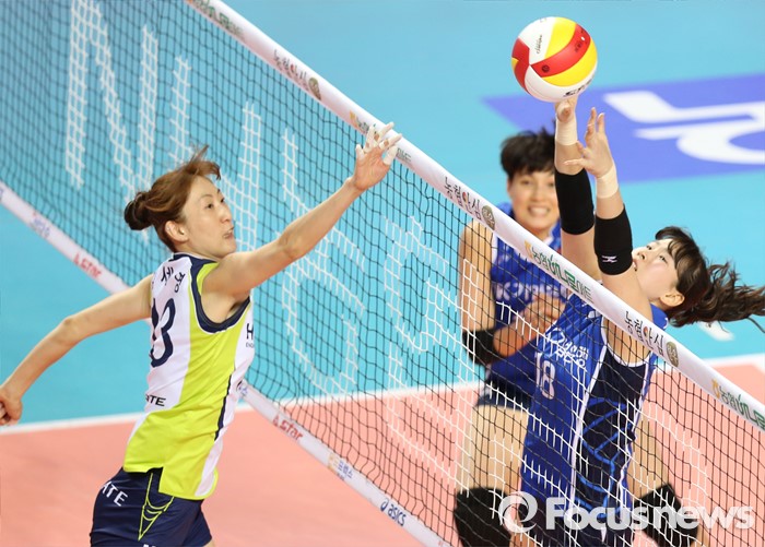 (화성=포커스뉴스) 17일 화성실내체육관에서 열린 2015-2016 V-리그 여자부 챔피언결정전 1차전 IBK기업은행-현대건설 경기에서 현대건설 김세영의 연타 공격에 IBK기업은행 김유리가 블로킹을 대고 있다.