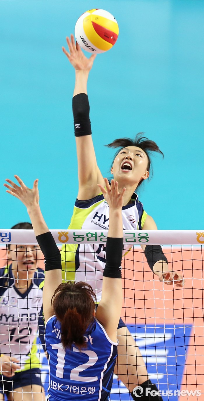 (화성=포커스뉴스) 17일 화성실내체육관에서 열린 2015-2016 V-리그 여자부 챔피언결정전 1차전 IBK기업은행-현대건설 경기에서 현대건설 양효진이 높은 타점으로 IBK기업은행 채선아와 김유리의 블로킹을 뚫는 스파이크를 넣고 있다.