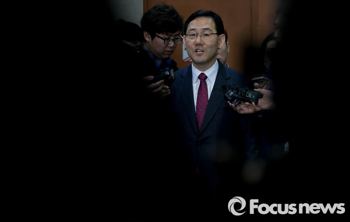 (서울=포커스뉴스) 공천 탈락한 주호영 새누리당 의원이 18일 오전 서울 여의도 국회 정론관에서 최고위원회의 재심 요구를 반려한 이한구 공천관리위원장과 관련 기자회견을 마친 뒤 취재진 질문에 답하고 있다.