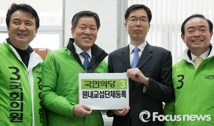 (서울=포커스뉴스) 18일 오전 서울 여의도 국회에서 국민의당 김영환(왼쪽부터) 인재영입위원장, 주승용 원내대표, 장병완 정책위의장이 국회의사국 관계자에게 원내교섭단체등록서를 제출하고 있다.