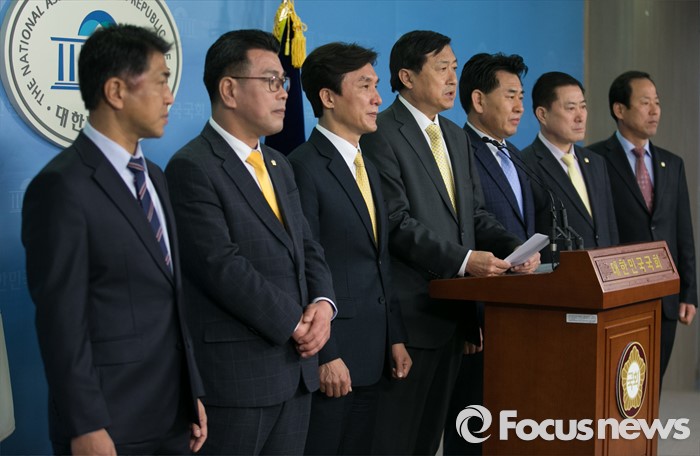 (서울=포커스뉴스) 더불어민주당을 탈당한 신기남(왼쪽 네번째) 의원이 18일 오전 서울 여의도 국회 정론관에서 원외 정당인 민주당 입당 기자회견을 하고 있다. 왼쪽 세번째는 김민석 민주당 대표.