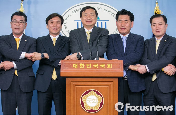 (서울=포커스뉴스) 더불어민주당을 탈당한 신기남(왼쪽 세번째) 의원이 18일 오전 서울 여의도 국회 정론관에서 원외 정당인 민주당 입당 기자회견을 마친 뒤 김민석(왼쪽 두번째) 민주당 대표 등 참석자들과 취재진을 향해 포즈를 취하고 있다.