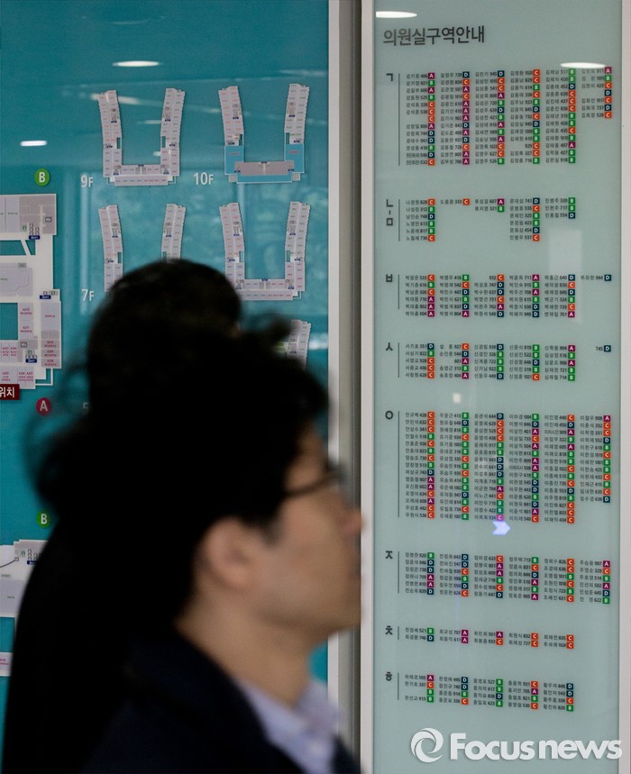 (서울=포커스뉴스) 18일 오전 서울 여의도 국회의원회관에 설치된 의원실구역안내판에 여·야 국회의원들의 이름이 적혀있다.