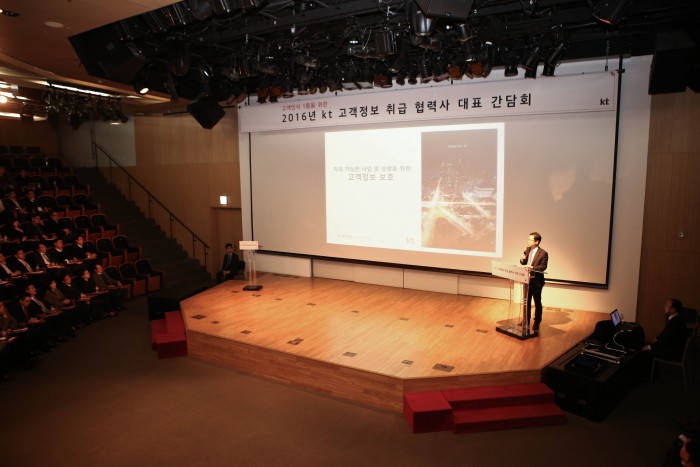 신수정 KT IT기획실장은 이날 행사에서 협력사 대표들에게 “개인정보의 안전한 취급 없이는 동반 성장 및 협력관계 유지가 불가능하다”면서 “개인정보 위탁업무 수행 목적 범위 내에서만 개인정보를 처리해야 하고 안전성 확보에 필요한 적절한 조치를 취해야 한다”고 당부했다.18일 열린 간담회에서 신수정 KT IT기획실장 전무가 협력사 대표들에게 고객 정보보호의 중요성을 설명하고 있다.<사진제공=KT>